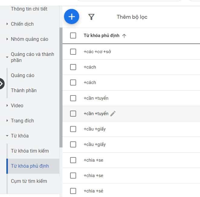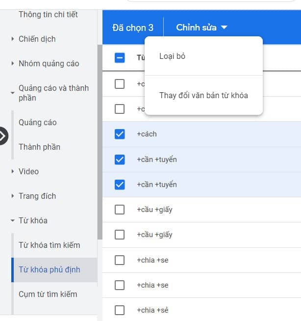 Bước 3: Tick chọn danh sách từ khóa phủ định mà bạn muốn áp dụng