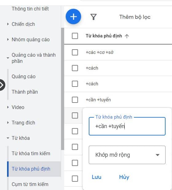 6. Hướng dẫn các thao tác sử dụng từ khóa phủ định Adwords