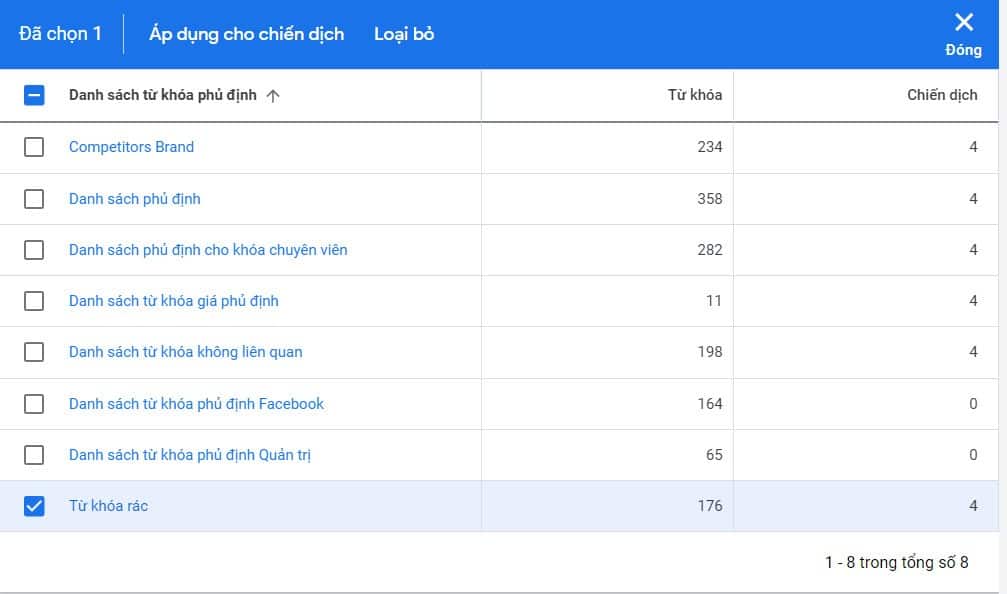 Bước 4: Tick chọn danh sách từ khóa phủ định bạn muốn áp dụng cho các chiến dịch đã chọn và bỏ tick các danh sách từ khóa phủ định cũ.