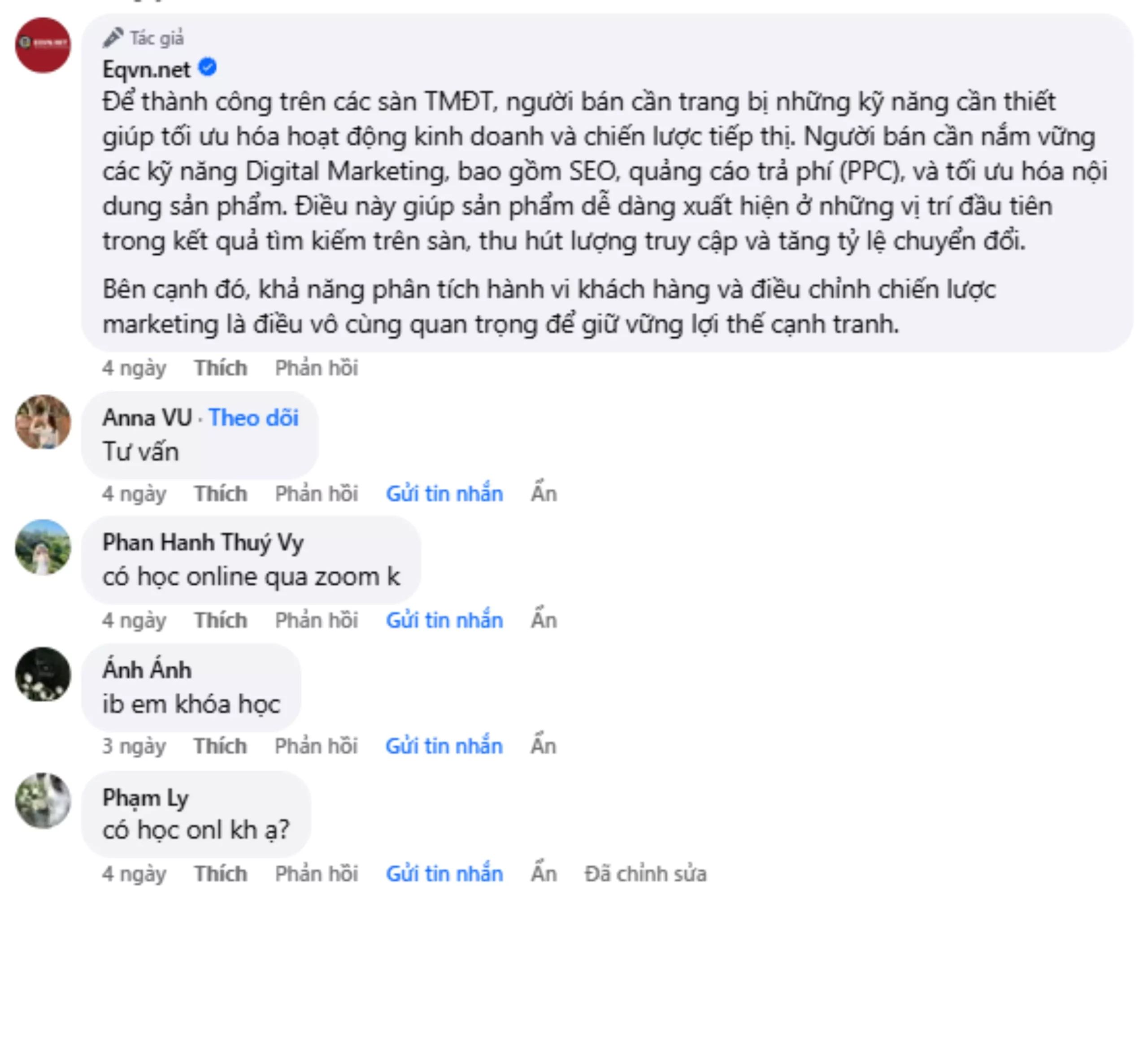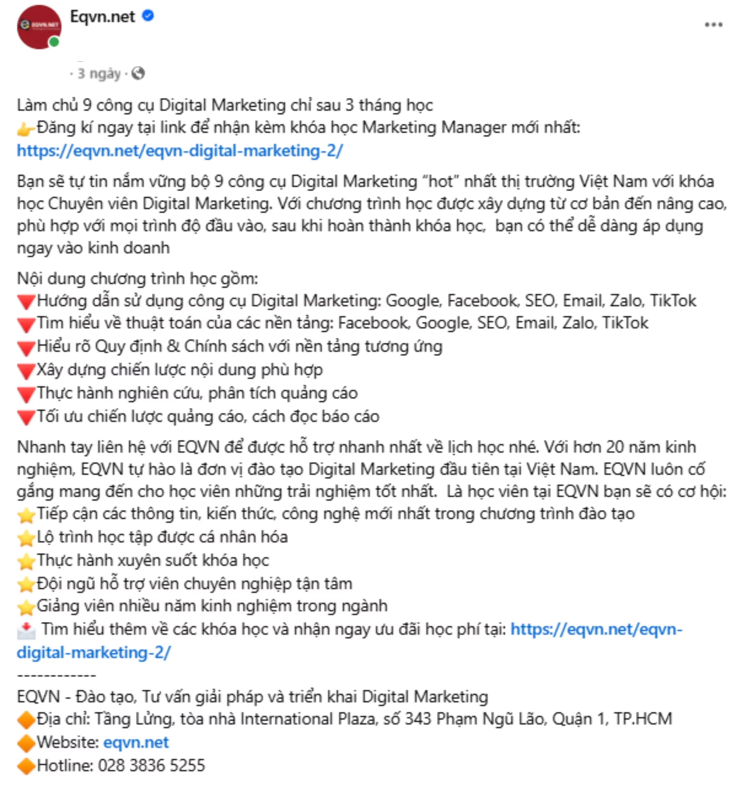 EQVN là đơn vị tiên phong trong lĩnh vực đào tạo khóa học Digital Marketing từ năm 2009 và là đối tác chính thức của Facebook và Google. Với kinh nghiệm hơn 20 năm, chúng tôi sẽ cung cấp cho bạn những kiến thức Digital Marketing mới nhất và hữu ích nhất! Tìm hiểu thêm về EQVN tại đây nhé!