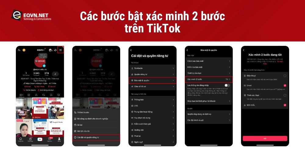 Bảo mật tài khoản TikTok là điều quan trọng để tránh bị đánh cắp hoặc xâm nhập trái phép. Một trong những cách hiệu quả nhất để bảo vệ tài khoản của bạn là bật xác minh hai bước. Tính năng này giúp tăng cường lớp bảo mật, yêu cầu xác thực bổ sung khi đăng nhập, đảm bảo chỉ có bạn mới có thể truy cập tài khoản. Trong bài viết này, EQVN sẽ hướng dẫn bạn cách kích hoạt xác minh hai bước trên TikTok một cách đơn giản và nhanh chóng.