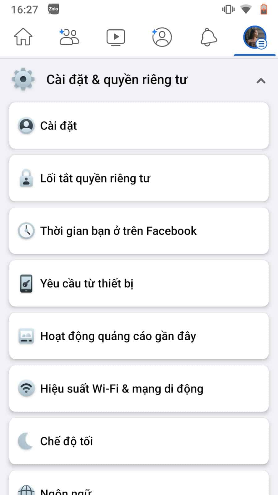 Bước 1: Từ màn hình chính của Facebook, bạn vào Cài đặt & quyền riêng tư rồi chọn Cài đặt.