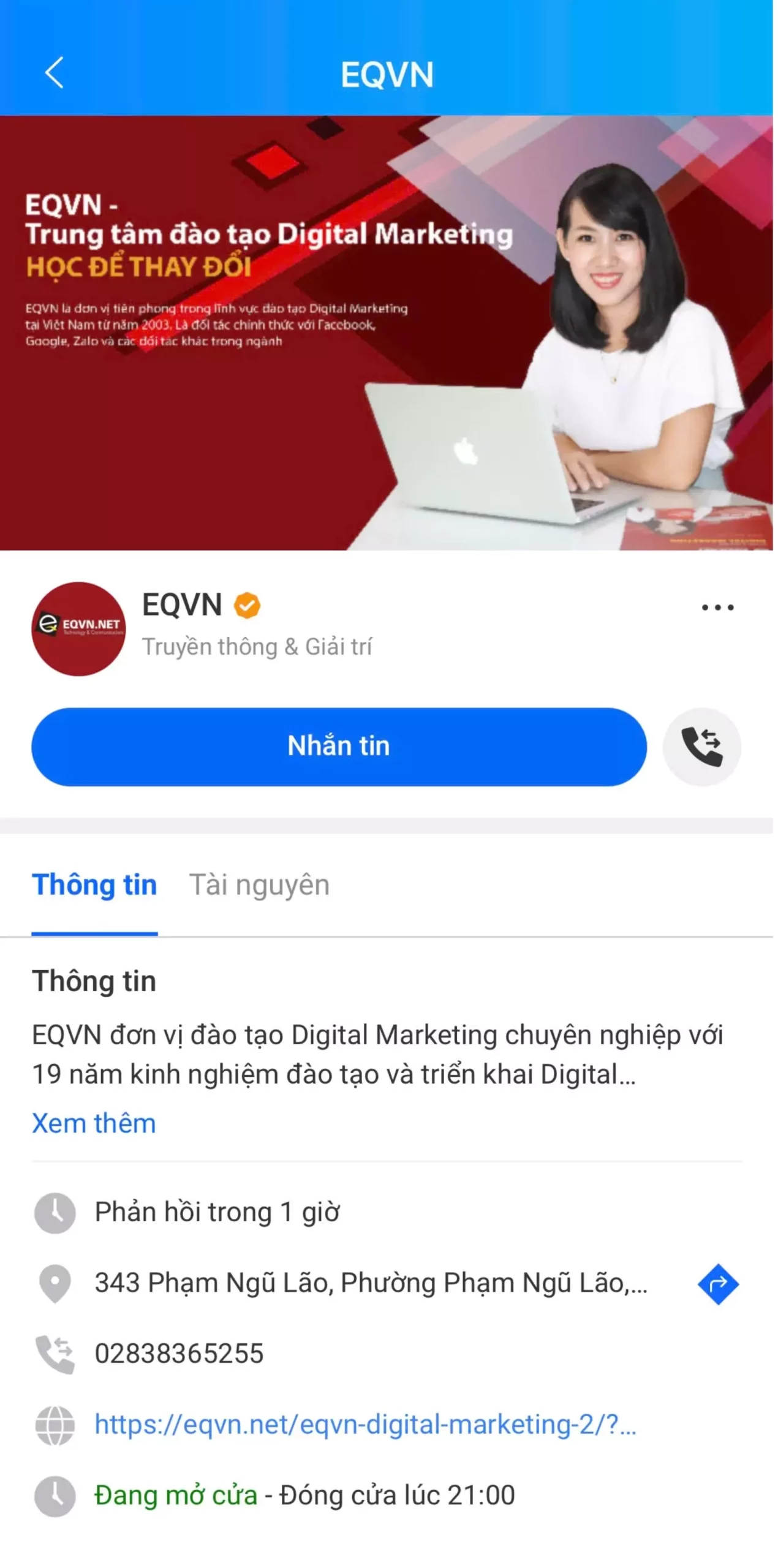 EQVN là đơn vị tiên phong trong lĩnh vực đào tạo khóa học Digital Marketing từ năm 2009 và là đối tác chính thức của Facebook và Google. Với kinh nghiệm hơn 20 năm, chúng tôi sẽ cung cấp cho bạn những kiến thức Digital Marketing mới nhất và hữu ích nhất! Tìm hiểu thêm về EQVN tại đây nhé!