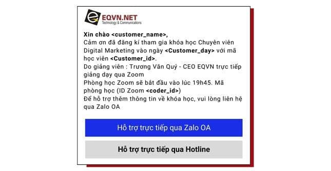 Nếu còn bất kỳ khó khăn nào để thấu hiểu dịch vụ ZNS, hoặc tổng quan nền tảng Zalo, bạn có thể tham khảo khóa học quảng cáo Zalo. Bộ tài liệu giảng dạy đa dạng về các khía cạnh khác nhau khi truyền thông trên nền tảng Zalo, cũng như các buổi thực hành dành riêng cho học viên theo học tại EQVN.